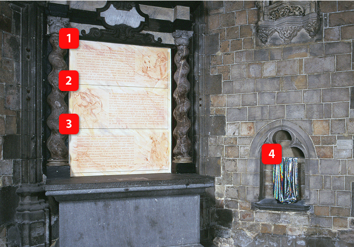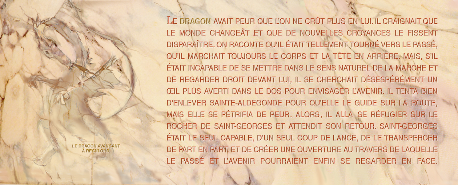 Le dragon avait peur que l’on ne crût plus en lui. Il craignait que le monde changeât et que de nouvelles croyances le fissent disparaître. On raconte qu’il était tellement tourné vers le passé qu’il marchait toujours le corps et la tête en arrière. Mais, s’il était incapable de se mettre dans le sens naturel de la marche et de regarder droit devant lui, il se cherchait désespérément un œil plus averti dans le dos pour envisager l’avenir. Il tenta bien d’enlever sainte Aldegonde pour qu’elle le guide sur la route, mais elle se pétrifia de peur. Alors, il alla se réfugier sur le rocher de saint Georges et attendit son retour. Saint Georges était le seul capable, d’un seul coup de lance, de le transpercer de part en part, et de créer une ouverture au traver