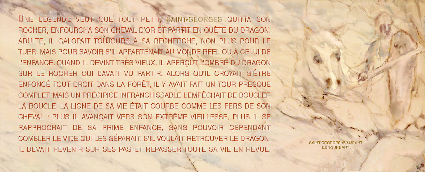 Une légende veut que tout petit, saint Georges quitta son rocher, enfourcha son cheval d’or et partit en quête du dragon. Adulte, il galopait toujours à sa recherche, non plus pour le tuer, mais pour savoir s’il appartenait au monde réel ou à celui de l’enfance. Quand il devint très vieux, il aperçut l’ombre du dragon sur le rocher qui l’avait vu partir. Alors qu’il croyait s’être enfoncé tout droit dans la forêt, il y avait fait un tour presque complet. Mais un précipice infranchissable l’empêchait de boucler la boucle. La ligne de sa vie était courbe comme les fers de son cheval : plus il avançait vers son extrême vieillesse, plus il se rapprochait de sa prime enfance, sans pouvoir cependant combler le vide qui les séparait. S’il voulait retrouver le dragon, il devait revenir sur ses pas et repasser toute sa vie en revue.