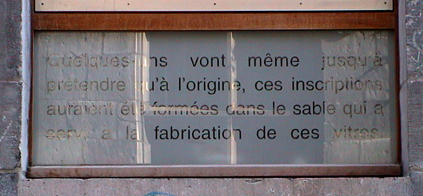 On raconte que la buée qui se dépose sur les vitres de certaines maisons fait réapparaître des inscriptions qui auraient été tracées des années plus tôt. Quelques-uns vont même jusqu’à prétendre qu’à l’origine, ces inscriptions auraient été formées dans le sable qui a servi à la fabrication de ces vitres. Elles auraient été écrites par tous ceux qui, partis dans le désert à la recherche d’une quelconque vérité, se seraient perdus dans des sables mouvants. Pour ne pas s’enfoncer trop vite, ils auraient tenté de calmer leur agitation en traçant des inscriptions produites par un agréable mouvement de main. Ils ne cherchaient pas à savoir ce qu’ils écrivaient ; ils voulaient seulement trouver les mots qui les retiennent le plus longtemps possible à la surface. Ceux qui en sont revenus passent leur temps à souffler sur les vitres avec l’espoir d’y retrouver leurs inscriptions et d’en comprendre enfin le sens.