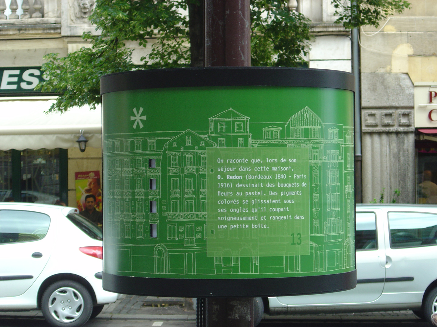 “O. Redon (Bordeaux, 1840 – Paris, 1916) dessinait des bouquets de fleurs au pastel. Des pigments colorés se glissaient sous ses ongles qu’il coupait soigneusement et rangeait dans une petite boîte. - On raconte que, lors de son séjour dans cette maison,