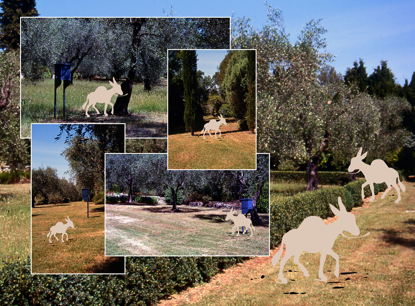 Notre âne ne s’occupe pas d’où il va. Peu lui importe de tourner à gauche ou à droite, ou d’aller tout droit. Il se meut, c’est tout. Le seul geste accompli à dessein est de battre des oreilles et des paupières pour chasser les mouches. Parfois — et c’est cette situation qui nous intéresse — il continue de battre des paupières alors qu’il n’y a plus de mouche. Il n’est plus alors qu’un mouvement capable de se mouvoir lui-même. Jusqu’à l’infini. Au centre de cette merveilleuse mécanique, son œil est celui d’un dormeur. Mais d’un dormeur qui nous regarde au plus profond de nous-même. Cet œil, inconnu de nous, nous poursuivra toute la journée. Il se gravera en nous comme certaines images trop violentes s’impriment en négatif dans notre rétine lorsqu’on ferme les yeux. Le soir, il nous empêchera de trouver le sommeil. Nous nous retournerons dans notre lit. Tantôt à droite, tantôt à gauche, tantôt tout droit sur le dos. Nous referons sur place le chemin de notre âne. Puis, petit à petit, ayant chassé toutes nos contrariétés, nous trouverons le sommeil paradoxal.