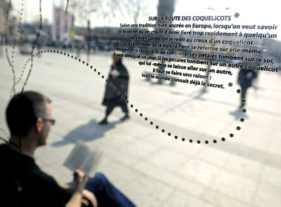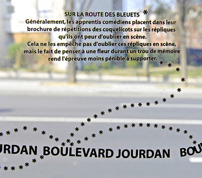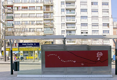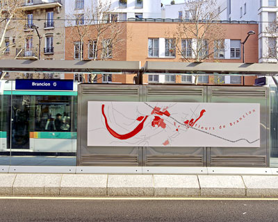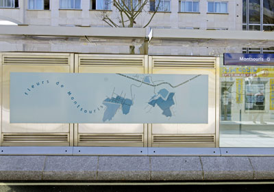 Sur les vitres, est apposé un vinyle transparent (100 X 150 cm), imprémé en noir. Il sera proposé un jeu de douze promenades qui chacune évoque penser à une fleur. Les douze promenades peuvent être présentées dans un ordre aléatoire car la ligne de lettre composée par le parcours du tramway se raccorde toujours à celle du dessin voisin. Chaque promenade propose l’histoire d’une fleur imaginaire présentée comme si on pouvait la découvrir dans les rues de Paris. Ainsi, vues de dos, les vitres seront vues comme un ensemble graphique, tandis que du côté des voyageurs qui attendent le tramway, les vitres apparaissent comme les pages illustrées d’un livre qui leur raconte des histoires. Toutes les histoires sont suffisamment courtes pour permettre une lecture entre deux passages de tramway.