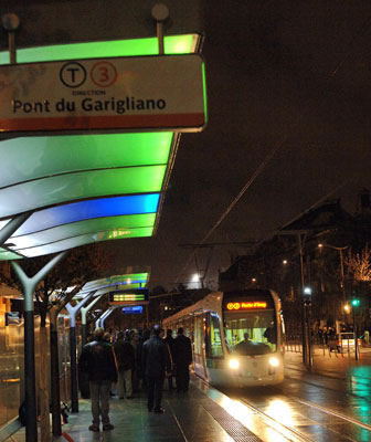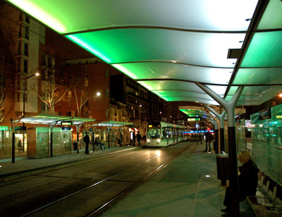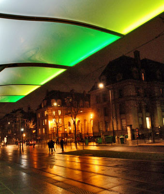 Le principe est de prolonger la bande d’herbe du site du tramway ; Ainsi, dans toutes les stations, les lumières des toits produisent un fond vert (variation de vert, ondulation comme le vent dans les prés). Et dans ces franges vertes poussent des fleurs. Il y a une couleur dominante de fleur par station (cette couleur est la même que celle de la plaque émaillée) ; donc chaque station est associée à une couleur particulière. Ces couleurs éclosent aléatoirement sur le fond vert (si cette couleur dominante est par exemple du rouge, on a des variations de rouge, du plus tendre au plus intense). Parfois une seule section voit éclore ce point coloré (j’appelle section chaque partie lumineuse autonome correspondant à la largeur d’une paroi vitrée), parfois deux sections à la fois, parfois plus. Ainsi, entre le passage des tramways, des taches colorées éclosent sur le fond vert. À l’arrivée du tramway, cette couleur envahit tout le vert (qui disparaît complètement le temps de l’arrêt à quai), comme si le tramway apportait toutes les fleurs, les emportant à son départ, puisque en partant, la couleur dominante disparaît pour ne laisser que le fond vert, qui petit à petit se couvre de taches colorées. De temps à autre, et aléatoirement également, un point jaune, comme une abeille qui butine, parcourt toutes les sections pour s’attarder sur une seule. Ce point qui circule rapidement peut également être bleu foncé comme un oiseau.