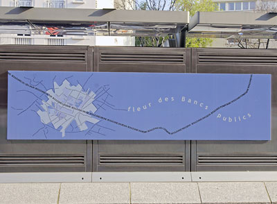 Au dos des boîtiers techniques sont placées des plaques émaillées (110 X 400 cm). Elles sont spécifiques à chaque station ; par le dessin, mais également par les couleurs proposées. Les couleurs des lettres et leur fond agissent en ton sur ton pour donner un effet de transparence qui répond à la transparence des dessins sur vitres. Chaque nom des fleurs de lettres fera référence à la station où les boîtiers techniques se trouvent. Les branches qui partent du rameau le font toutes du même point qui correspond à l’emplacement de la station sur la ligne du tramway.