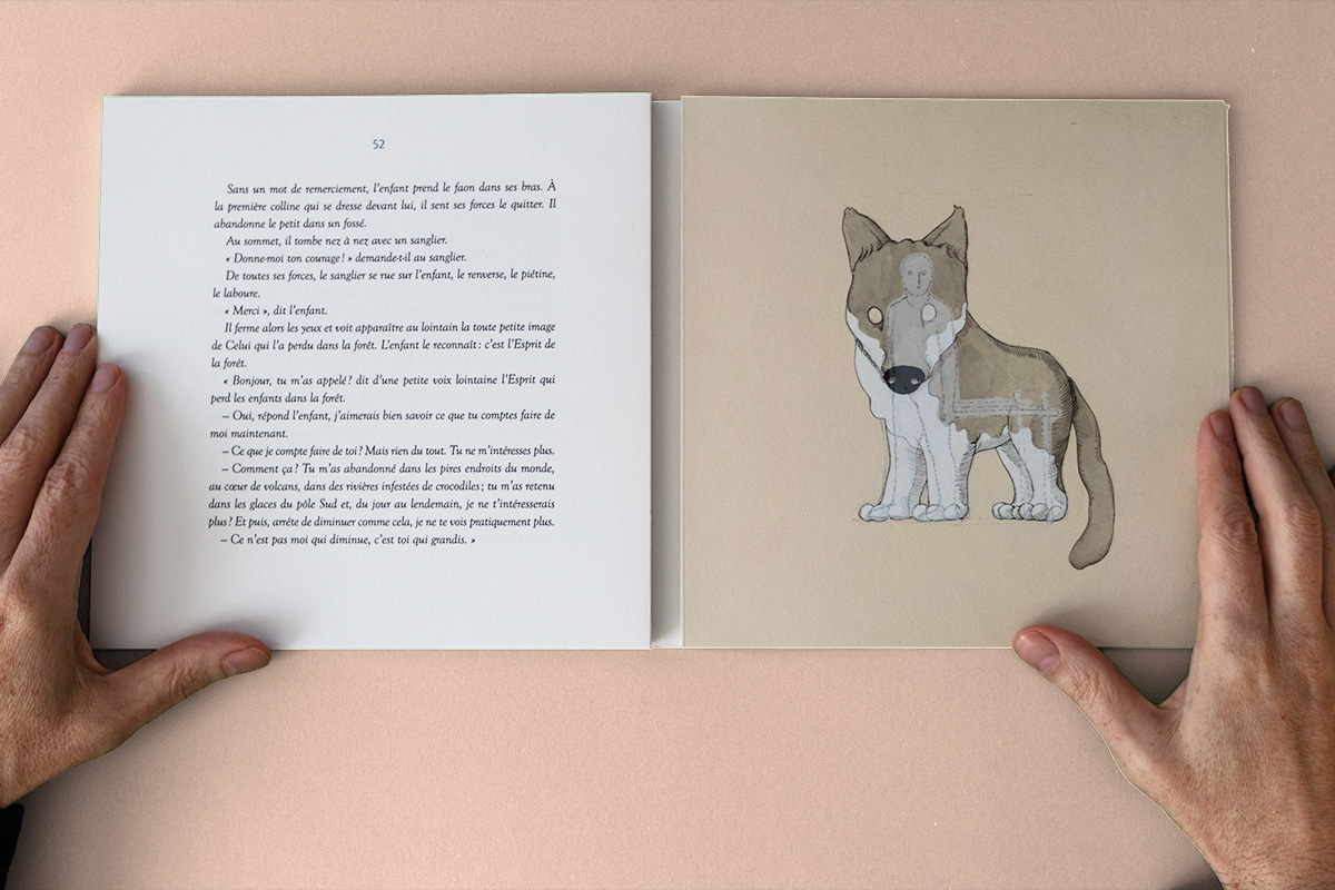 L’enfant embrasse alors la forêt de son regard. Il n’en voit pas la fin. Il se sent terriblement seul. Il cherche un compagnon, quelqu’un avec qui jouer. Il rencontre une biche. « Donne-moi ton petit qui va bientôt naître ! » …